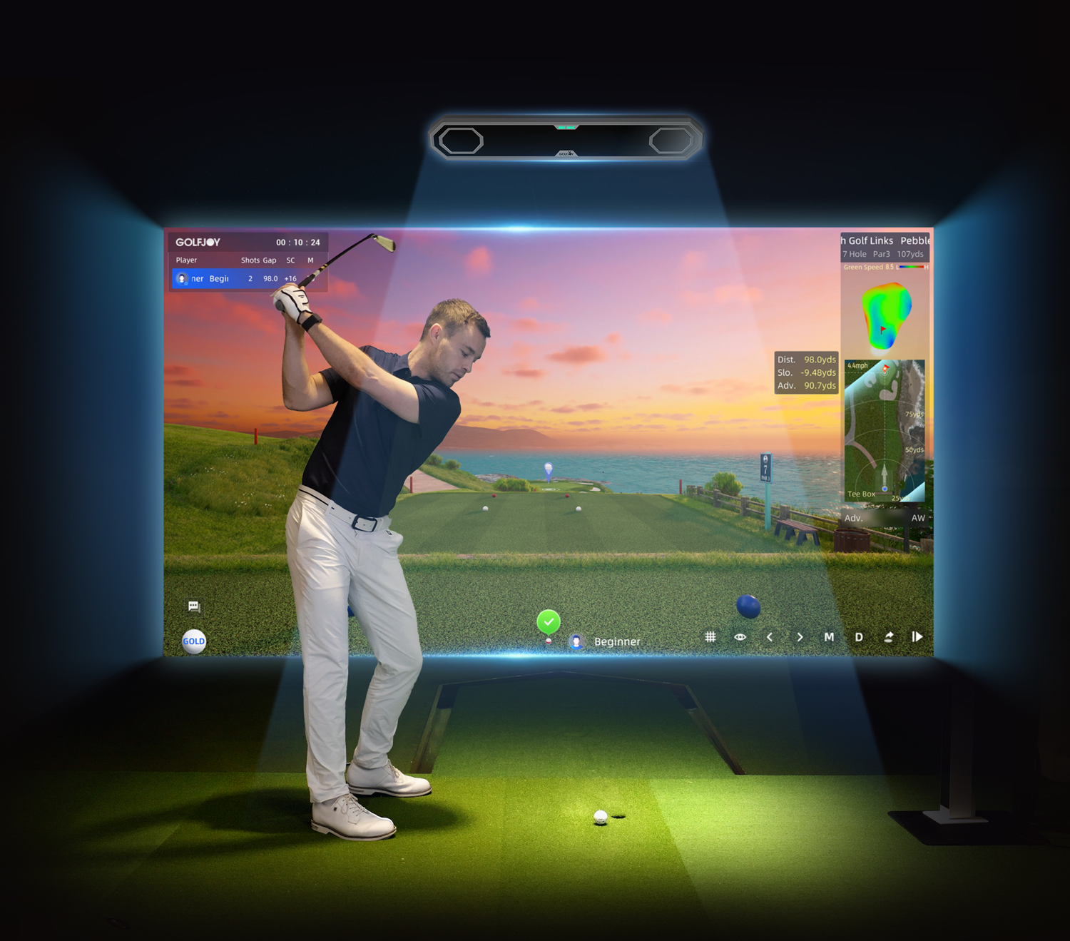Automatically activates within 4 yards of the green, offering 200+ short putt experiences with 3 cup groups and 11 power devices to simulate green conditions.