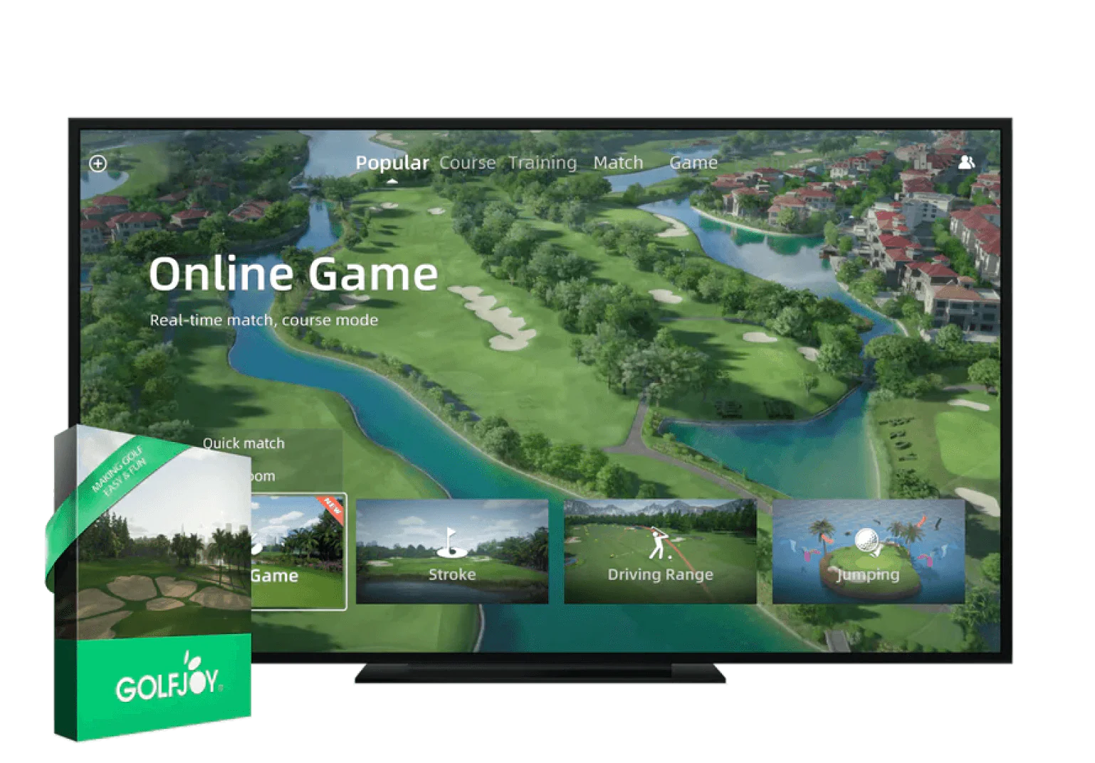 The GolfJoy Software brings all GolfJoy launch monitors and simulators to life. Play on more than 140 virtual courses in up to 4K image quality, practice on the driving range, analyze your data in real-time, and challenge golfers worldwide through online multiplayer. Available in three packages: Basic, ProTour, and Major.